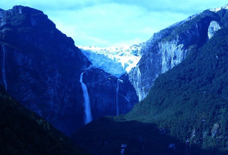 Très bonne nuit et c'est en forme que nous partons vers Puerto Aysen et Puerto Chachabuco. La route est entièrement goudronnée et c'est une grande surprise. A Puerto Chachabuco nous trouvons du poisson (saumon et quelques poissons inconnus pour nous) ce soir nous ferons du BBQ et pour une somme dérisoire, 1kg de saumon pour 3300$Ch (environ 5.20€) et 6 poissons pour 1200$Ch (soit 1.55€), a ce prix il ne faut pas se priver. Autrement ces deux villages ne nous laisserons pas un souvenir grandiose et nous filons maintenant vers le Parque Queulat et toujours par une route goudronnée jusque 25km avant l'entrée du parc. La mythique "carretera Austral" que nous avons connu n'existe plus et c'est bien dommage. Une partie reste encore en piste mais pour combien de temps car les travaux vont bon rythme. Nous faisons un stop au camping du Parque Queulat, il est 16h00 quand nous y arrivons et resterons là pour la nuit car les bivouacs sont quasi impossibles dans cette portion de piste. Nous allons pouvoir nous y faire le BBQ tant attendu et passer une très bonne soirée après une randonnée vers une "Laguna" avec vue sur une belle cascade descendant d'un glacier. Le temps est sec ce qui nous change de notre premier passage en 2011, demain nous irons faire une plus grande balade si le temps le permet.