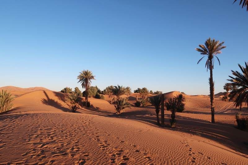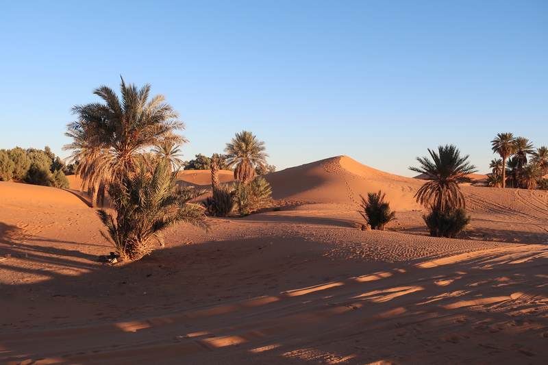 C'est parti jusque Merzouga, 0° ce matin mais grand soleil donc tout va bien. Nous allons nous poser chez Zaïd au Petit Prince où nous étions venus l'an dernier avec Babeth et Gérard, nos amis montagnards. Pas grand monde, faut dire que le parking est tout petit et cela nous convient très bien. En plus le restaurant est très agréable et les tagines succulentes, nous y dinerons ce soir. Une fois installés, nous partons nous balader vers les dunes, seuls, c'est très agréable, nous profitons des belles couleurs de la soirée.